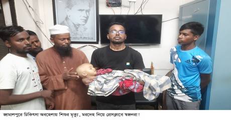জামালপুরে চিকিৎসা অবহেলায় এক শিশুর মৃত্যুর অভিযোগ উঠেছে। গতকাল শনিবার রাতে সেই মৃত শিশুটির মরদেহ কোলে নিয়ে হঠাৎ জামালপুর জেলা প্রেসক্লাবে হাজির হয় তার পরিবার ও স্বজনরা।
