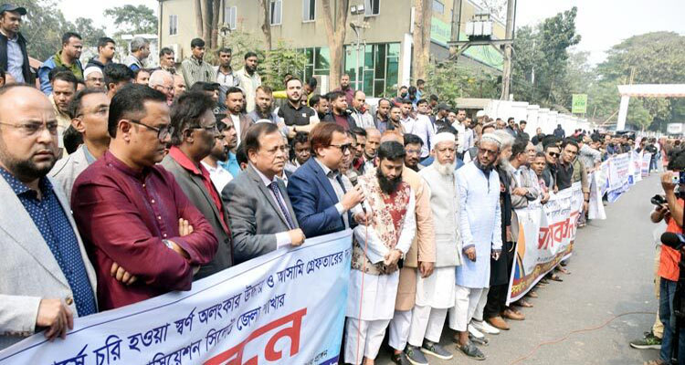 বৃহস্পতিবার (৩০ জানুয়ারি) বাংলাদেশ জুয়েলার্স অ্যাসোসিয়েশন (বাজুস) সিলেট জেলা শাখার আয়োজনে মানববন্ধন কর্মসূচি থেকে এই হুঁশিয়ারি দেন তারা। দুপুর ১২টার দিকে নগরীর চৌহাট্টায় কেন্দ্রীয় শহীদ মিনারের সামনে মানববন্ধন হয়।
