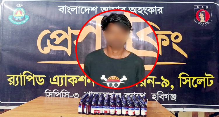 র‍্যাব জানায়, চুনারুঘাট থেকে মাধবপুরগামী সড়কে সন্দেহভাজনভাবে কালো ব্যাগসহ এক ব্যক্তিকে দাঁড়ানোর সংকেত দিলে তিনি পালানোর চেষ্টা করেন। তাৎক্ষণিক ধাওয়া করে তাকে আটক করা হয়। পরে ব্যাগ তল্লাশি করে ৬৬ বোতল ইসকফ সিরাপ উদ্ধার করা হয়।
